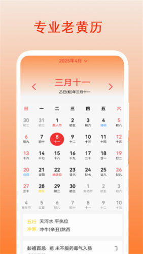4、提供全面黄历日历功能,随意查询黄道吉日、每日的宜忌,用户可以自助查找看日子、择日子、选好日子,直观又简单。