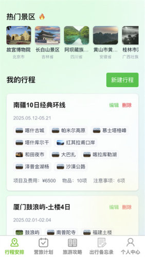 进入app后,在首页中选择“新建行程",并添加想要去目的地、活动内容、出发时间和交通,即可得到个性化的日程表安排。此外,露营爱好者将可以自己设定属于自己的营旅计划,并在推荐列表中选择想要去的营地或者添加想要去的地区,并通过应用了解营地说明以及相关照片。