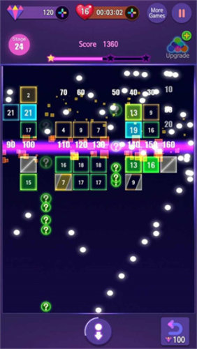 进入游戏后,玩家只需要滑动手指来控制小球的发射方向,目标就是把屏幕上的砖块全部打掉哦每块砖都有数字,表示它需要被击中多少次才能破碎所以得找好角度利用反弹才是关键哦,消除得越多得分就越高后续还能解锁更多关卡和超厉害的道具哦。