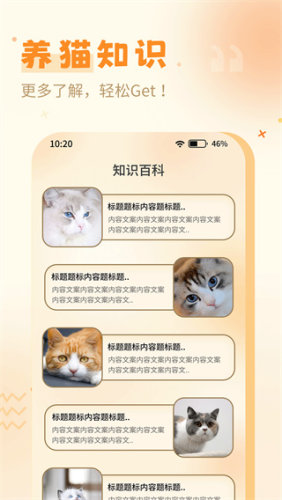 1、提供了海量的养猫知识,让新手铲屎官可以更加了解正确的养猫方式,帮助增加与猫咪之间的亲密关系;
