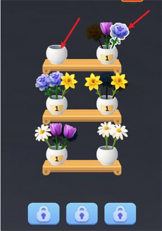 《花开大吉》是一款简单又轻松的休闲游戏,玩家只需要把一样颜色和一样品种的花朵放进同一个花瓶里,它们就会自动消除,每一关都有不同的花朵组合,前面简单,越后面越难。