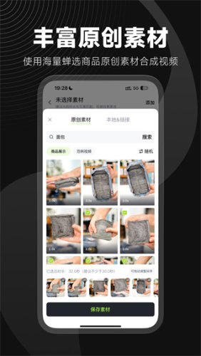 打开应用后,可上传本地视频、图片素材,或一键选择平台里提供的任何商品的素材,并可自行选择智能剪辑或者自行剪辑,完成剪辑后,即可一键导出进行保存,或分享至各大平台。