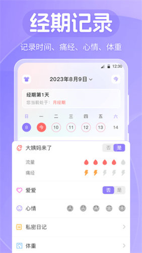 2、提供了经期周期记录的功能,让用户可以在经期时记录日期,以及各种经期时的身体状况,方便下次查看;