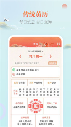 3、采用了复古风格的界面,让APP更加符合主题,更具有传统风,更贴近黄历查询的风格。