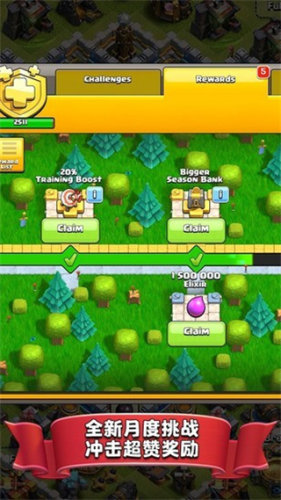 从一座小型的村庄开启游戏,通过建造金矿,圣水器,防御塔,军营等等的建筑设施。通过收集各种资源,一步步的提升所有的资源产量,村庄防御能力等。系统还提供超多各种不同定位的军力,当中包括野蛮人,弓箭手,哥布林,巨人等等丰富的兵种。每一个兵种都有着自己独特的战斗方式,了解当中,合理的进行分配,顺利完成战斗。在战斗当中,玩家可以自由的选择主动发起攻击或是进入他方村庄的侦查,根据策略在获胜率很大的村庄下手,摧毁敌方的堡垒,获得胜利以及奖杯。