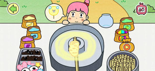 首先将顾客指定的砂糖颜色放入制作棉花糖的机器中,然后点击打开机器并跟着教程慢慢的拖动棒来完成各种造型的棉花糖。