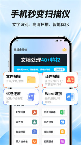 《扫描全能侠拍照扫描》是一款多功能扫描的APP,只需要一个APP就可以扫描文件、证件、表格识别、拍照翻译等,让用户可以自由进行导入并进行编辑,适合不管是学生、办公族等,帮助提高效率。,无需通过多个不同的软件或设备即可搞定。