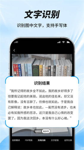 4、可通过拍照扫描进行识物、拍照翻译、证件扫描等,各种生活上需要扫描的需求都可以轻松满足;
