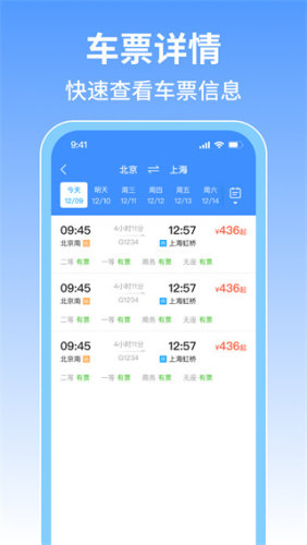 4、各种关于车票的信息非常清晰,价钱、班次都将会实时同步更新,避免用户受到过时的信息,打扰全部的出行计划。