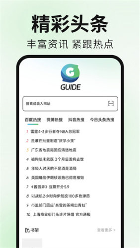 《Guide浏览器》是一款多功能的浏览器APP。极快的简单快捷的上网体验感,一秒即可开启搜索各种资讯,无需浪费等待的时间,各种功能将任意使用,满足工作或生活中的多种需求,提高学习或办公的效率。