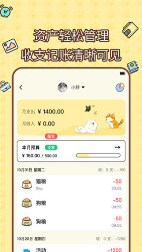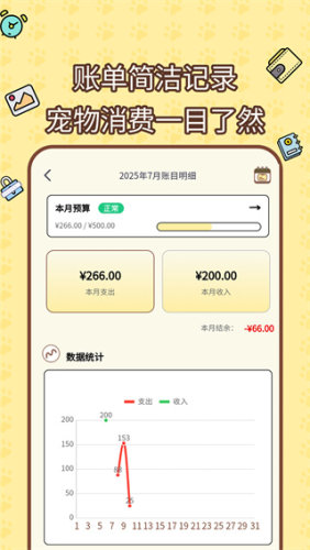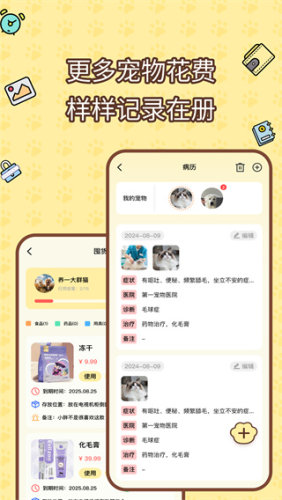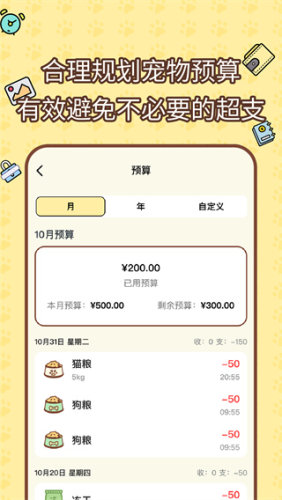 1、简单记录各种关于宠物的日常支出,如:狗粮、美容、疫苗等等,让用户可以仔细了解每一笔费用的去向;