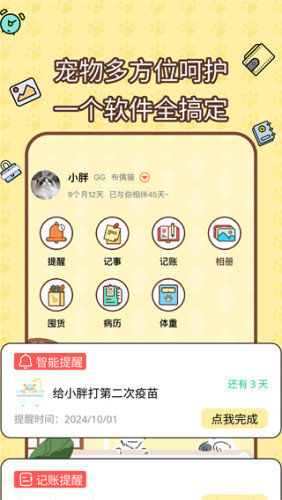 2、添加不同提醒,如:复诊、打疫苗、驱虫药等,APP将会根据所设定的日期提前发出提醒通知,避免遗忘;