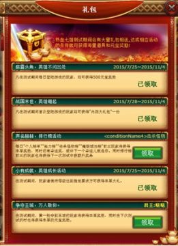 游戏开服的第一天中只能领取每日礼包和内测礼包。 每日礼包会赠送500元宝。 记得每天都要领取。 内测礼包会送各种物品。商城物品也有。