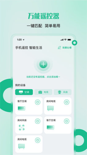 在软件里,用户根据需要选择使用的遥控类型就能开始操控家电设备了,轻松告别传统电池遥控器,手机就能进行遥控。软件采用红外线就能操控家电,连接和添加设备以后就能精准进行设备操控,还能够同时控制多个家电。