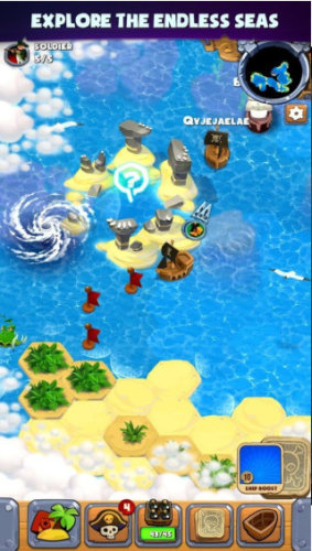开启游戏后,玩家将扮演成为一名初入海域的海盗角色,尝试驾驶着自己的小船,在广阔的大海当中,自由的航行前进。同时,玩家可以自由的选择探索各个不同的岛屿场景,寻找出隐藏在角落的宝藏或是主动发动攻击的方式将宝藏从别人的手中抢夺完成。累计更多的资源,帮助提升船只整体的等级,扩展船员阵容等的方式逐渐的扩展势力。当然,在一片海域当中充满了未知,除了收集宝藏还将面临各种神秘的时间发生,自由的探索收集游戏金币,武器,食物等资源。