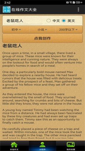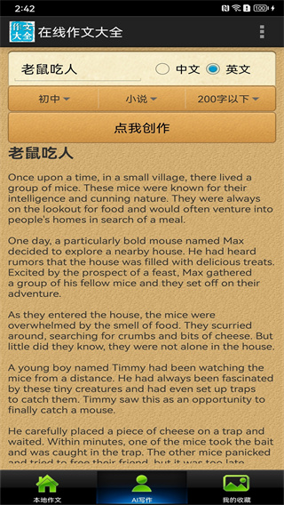 2、智能写作,用户只需输入题目与字数即可自动生成作文,还能够收获到不同的新的词汇与成语,增加知识储量;