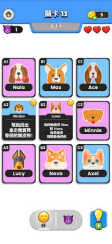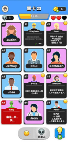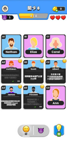 玩家将扮演一名侦探,你需要好好的运用自己的智慧,来推导剧情,并揭开隐藏在每个关卡背后的真相。而每个关卡都会有一张卡牌是公开的,玩家通过第一张卡牌给到的信息进行推测,选择下方的好人还是坏人点击其他卡面。每点开一个好人卡面都会给出更多的线索,长按卡面可以查看性别以及职业等。你需要在规定的容错次数中成功的挑选出罪犯则成功通关。