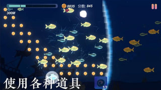 2、按住屏幕小鱼会上浮,松手它就往下游,主要就是避开障碍,吃掉比玩家小的鱼,还能收集小宝石;