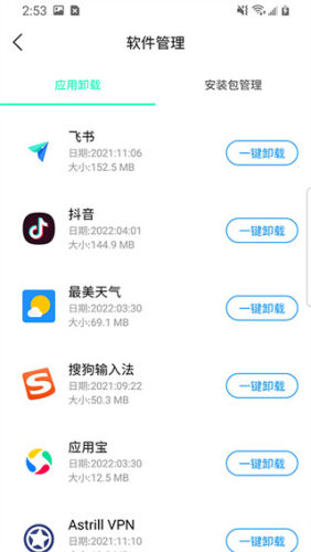 1、软件还支持批量卸载不常用的软件,快速释放手机空间;