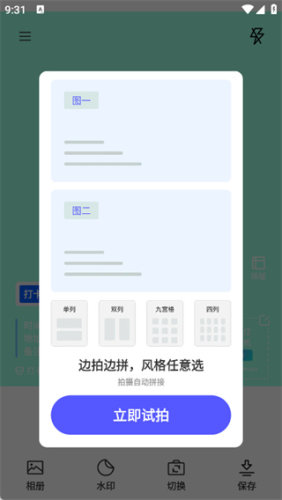 下载软件后就能直接的打开进入主要页面,快速的进入拍摄的页面当中,提供给用户更高效的添加水印。在水印的库中,提供了丰富的水印模版的素材,适合用于,考勤打卡,工作办公,工程记录等等的分类类型。所有的水印地址可以根据自由的设下定位,选择各个不同的地址呈现出来。接着,进入了拼图的页面中,只需要根据自己的喜好选择拼图模版,轻松就能完成操作。