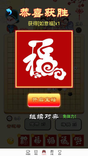 在进入游戏中后,各位玩家们可以选择闯关集福真人对弈或趣味模式,闯关模式下可以点击开始选择喜欢的棋子样式然后进行对弈率先连成五子者获胜并可获得随机福卡,对弈过程中合理布局抓住每一个攻防机会是取胜关键,顺序和时机也非常重要避免贸然进攻必要时防守反击才能笑到最后。