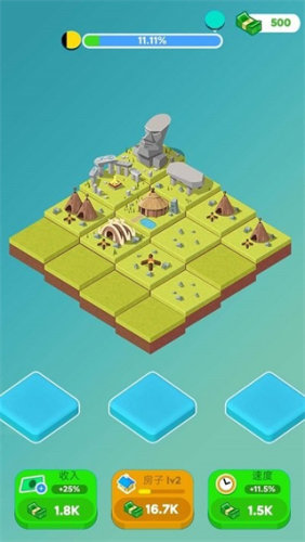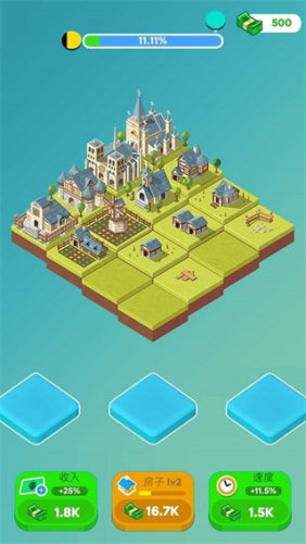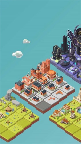 开启游戏后,玩家就能直接的观看到网格状的地图场景,当中将会出现各种低级的建筑,如有小木屋等等的类型。作为休闲类型游戏,玩家只需要通过拖动与合并的方式将两个相同的建筑物就能成功的提升建筑的等级。随着建筑持续的提升等级,城市的规模也逐渐的变大,从一个农舍到商店,更是在变化成为高楼等,一步步的成为城市的景观。当中包含了合成奖励的机制,只需要一次性的合成就会触发连锁反应,玩家将获得额外的丰厚金币和道具。