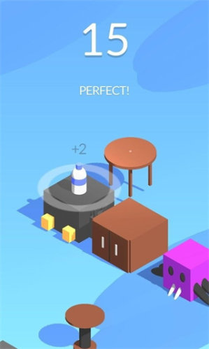 这款游戏操作简单,快速就能上手,玩家只需要以点击的方式不断地蓄力,操控着瓶子起跳的距离,一旦松手就可以起跳,考验玩家的事迹掌控和力度上的掌握能力,尝试稳定的降落在一个平台上。在平台与平台之间的距离都各自不想听,有些比较解决可以快速的解决,而较远的距离则要掌握当时蓄力的力度才能安全的跳上另外一个平台。完成游戏后,可以获得钻石,用于兑换炫酷的瓶身,展现出个性化的游戏体验进行。