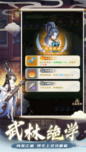 在游戏中,玩家将会置身于一个纷争不断的武林之中,你需要扮演一名初入江湖的侠客,然后结识各路豪杰,接下来组建专属的侠客队伍,一同踏上征战四方的热血旅程。游戏拥有丰富的门派系统和多样有趣的武学招式,玩家可根据战局自定义的组合阵容,施展个性战术。