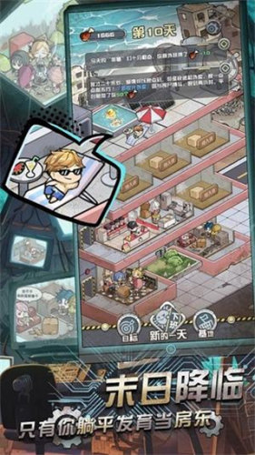 在一个末日时期的环境下展开一场经营类型游戏,在游戏当中,玩家将会在废区的场景当中,扮演成为一名房东的角色,一边维持着自己的升级,同时抵御周围出现的僵尸群所伴随和各种灾难和威胁。通过整理书包,策略布局,打造出一个属于你的末日庇护所。