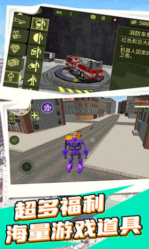 进入游戏后,系统会赠送五百金币可用于购买基础武器,通过点击右侧按钮可以变身汽车开始跑酷再次点击即可恢复机甲形态进行战斗,长按跳跃键可以轻松跃上屋顶体验飞檐走壁的快感,击败敌人能获得金币返回首页点击购物车图标可购买更多装备,提升战力通过地图查看敌人位置或医院位置确保及时恢复状态。