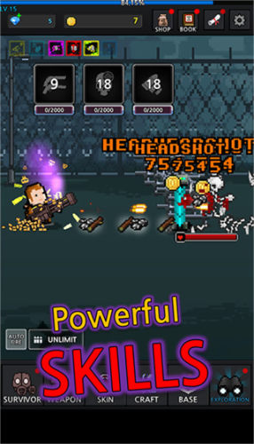 1、击败僵尸收集资源,不断强化角色和武器,战力飙升;