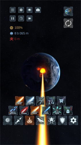 进入游戏后,选择一颗星球点击右侧的武器菜单挑选想要使用的攻击方式,比如核打击啊黑洞啊陨石撞击等每种武器都有不同效果,攻击后可以实时看到星球被破坏的细节想更刺激可以切换模式,各位玩家们是需要去控制导弹然后精准的打击甚至是操控飞机去进行攻击啊。