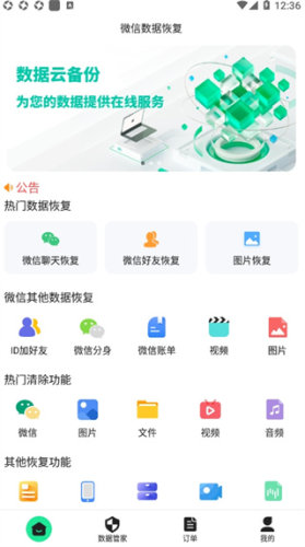 下载软件后,用户只需要点击打开就能直接进行首页,当中设有便捷的一键点击聊天恢复功能,图片恢复等等不同的模块,根据用户的要求自由的进行选择使用。当中提供了数据管家的功能机制,帮助手机上图片备份,视频备份,文件备份等等的要求,只需要一键就能直接完成操作,轻松且实用。查询订单模块随时都能查看自己所有订单的信息出现。无需登入也能免费的使用使用的机制功能。