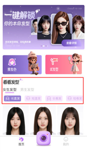 安装下载软件后,只需呀点击同意用户协议就能快速的直接进入软件的主要页面。在首页中,就能直接查看到发型发现的功能板块,当中存分类的选择,只需要根据自己的特色进行点击,就能快速的战士出最新且流行的发型选项,如有短发,烫发,寸头等等的类型。系统还提供虚拟染色的功能,自由的调整自己的发色,或是点击试发型功能,浏览完成后就能尝试效果。在拍摄的页面中,支持直接拍照或是在相册中导入照片,由AR技术就能实时光看到染发后的发型效果。