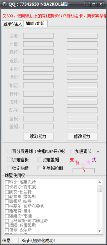 功能1:改能力 (0~99999)12项属性任意修改, 三分线直接扣篮,随意秒板,抢断牛B。