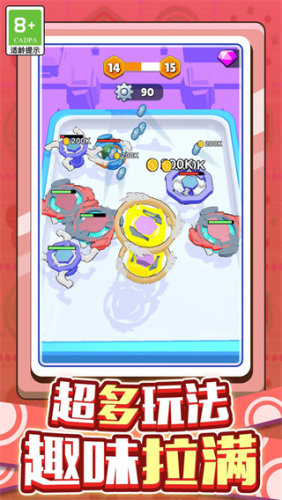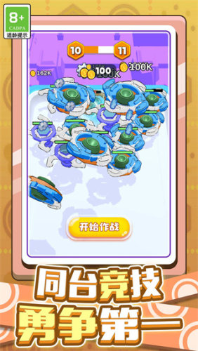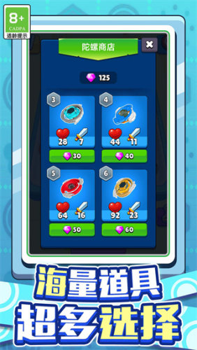 1、采用合成进化的游戏机制,只需要将两个相同的陀螺合成升级,解锁更多形态;