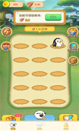 在初始阶段时,玩家需要使用金币来购置一定数量的动物,并开启你的牧场养成之旅。你还可以通过不断合成与升级,推动动物们的进化,让它们迈向更高级别。而不同等级的动物会产出不同数量的鲜肉,你可以将这些鲜肉出售,这将会是你的主要经济来源。随着游戏不断地进行,玩家可以解锁更高级别的神兽,能够显著提升整体牧场的产肉效率和收益。