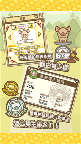 进入游戏后,先从普通猪猪开始饲养注意喂食和清洁保持它们的健康成长,通过配种可以解锁更多新品种有机会获得稀有猪。使用狩猎门票还能在活动中捕捉到新的小猪,随着猪猪数量和品质的提升玩家们可以参加竞拍,把猪猪卖出高价提升主人的排名,所有养过的猪都会记录在图鉴中收集欲满满。