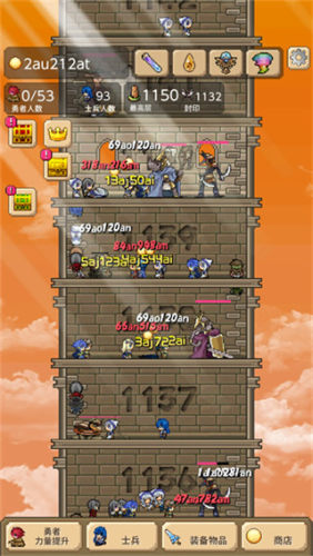 进入游戏后,玩家需要召唤勇士加入队伍利用自动攻击和技能来不断击败敌人,随着塔层升高敌人会变得更强这时就需要通过升级勇士等级和购买装备来提升整体战力,装备和道具不仅能提高输出还能帮助玩家们快速击败高属性BOSS,金币资源在游戏中非常重要可以用来扩大队伍规模,让更多勇士参战形成强大的战斗力。