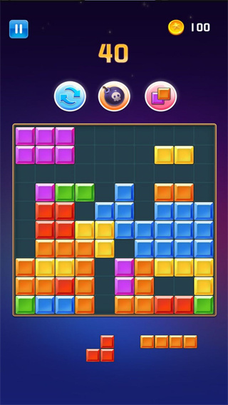 游戏的玩法很简单,玩家们只需要将从上方掉落的方块,通过点击屏幕尽心移动或旋转,然后策略性地填充在正确的位置,成功排列成一排就可触发消除效果和获得分数,很有趣。