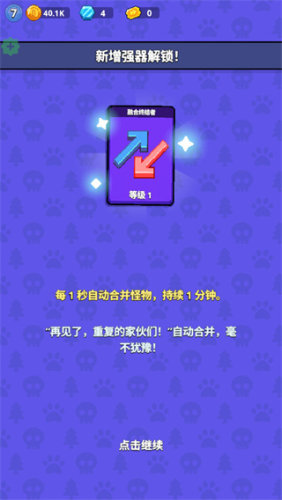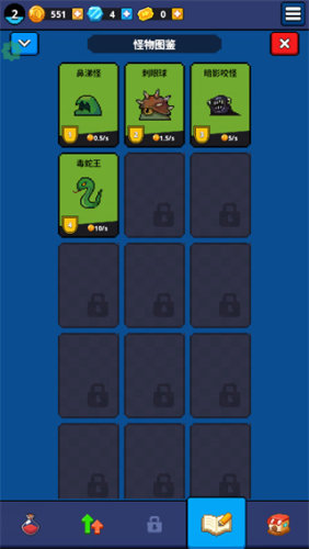 打开游戏后,先点击合成怪物的选项。然后,把两个怪物放在一起,它们就会自动升级。升级后,玩家还能获得金币宝箱等奖励,帮玩家更快进步。继续一直不断地合成和升级,还能开启更多新的游戏世界,带来更多新鲜挑战。