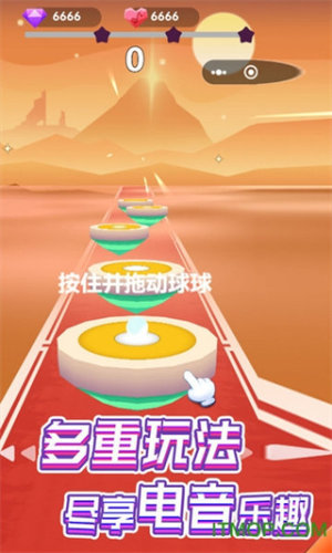 在《电音滚滚》里,玩家需要控制小球沿着轨道挑战,伴随着音乐的节奏完成精准的跳跃。开始时音乐节奏会以较慢的速度让玩家适应跳跃和避开的节奏,随着关卡推进,就会逐步的增加难度,有时候需要连续跳跃或者更加精准跳跃才能过关。跳跃的同时需要玩家收集钻石,能够用于解锁新场景和关卡主题。