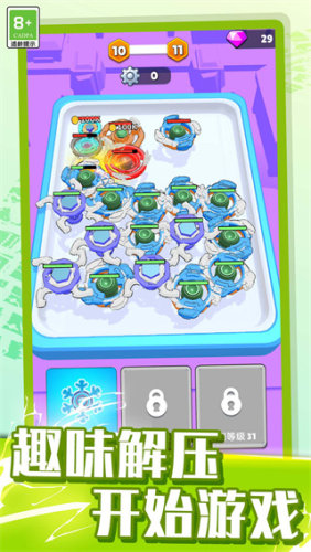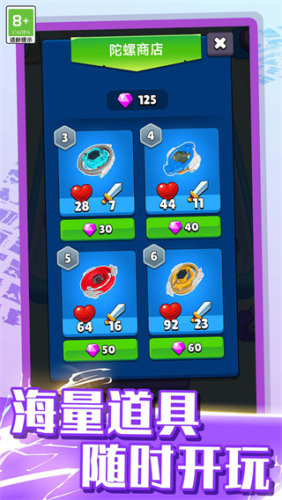 一开始可以购买自己的陀螺,准备投入战斗。通过合成陀螺,玩家可以一直不断地升级,解锁更强的新陀螺。进入竞技场后,自由与其他玩家对战,操控陀螺展开进攻。只要策略得好、操作精准,就能击败对手。还可以带着自己的陀螺去和其他玩家对战,赢得胜利和奖励。游戏关卡丰富多样,玩法充满了创意,不同类型的陀螺都有各自特色,轻松上手又能体验策略的乐趣。