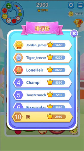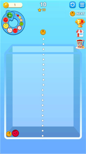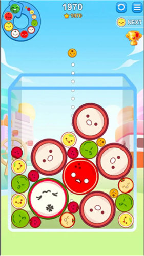 3、下一颗要掉下来的水果是随机的,不过你可以提前在左上角看到提示,方便选择放的位置。