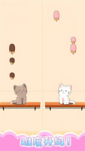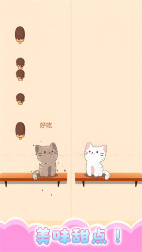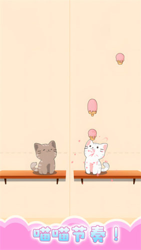 4、点击灰色猫咪吃下褐色的冰淇淋,相反白色猫咪就需要持续啊粉色的冰淇淋,两边相互合作,可以不断累计到更高的分数。