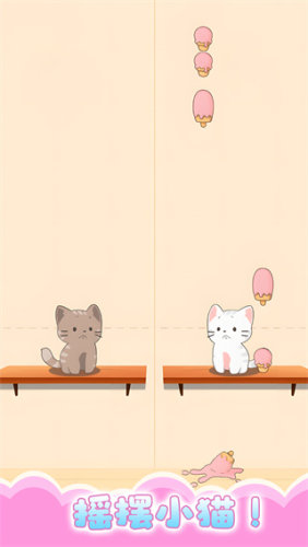 1、操作方式简单,只需要操控指尖进行长按和拖动的方式就能有效的控制买米进行移动,一档发现上方的冰淇淋坠落,快速的移动猫咪来接住,就能获得相应的分数。