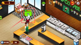 4、进入咖啡厅中,根据箭头的指示点击,柜台上有着咖啡机和餐台的设备,快速掌握操作技巧。