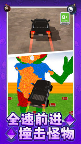 游戏开始前需要玩家先购买一辆越野车,游戏会给提供足够的金币。完成购买之后可以开始选择游戏模式,有些模式在等级足够后才会开放。进入游戏之后,玩家需要灵活的躲避障碍物或者把积木建筑物撞飞直线抵达终点。游戏内还有不同的怪物BOSS和角色,并且也有解锁一定等级后玩家也能使用技能。