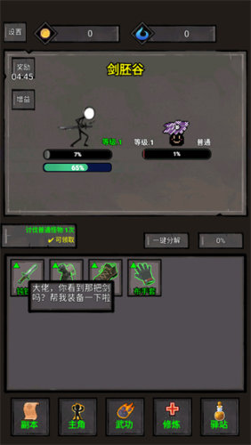 4、击败敌人后,怪物有机会掉落装备,记得查看并装备上更强的武器和防具,让火柴人更强大。