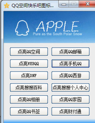 QQ空间快乐吧图标点亮软件是一款QQ图标点亮软件,这款软件可帮助用户快速点亮QQ空间、QQ邮箱、WEBQQ、手机QQ、搜搜百科、搜搜个人中心、QQ相册、QQ家园、QQ书签、财付通等图标。